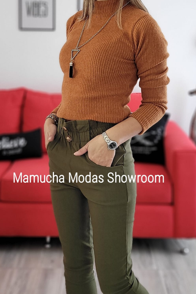 Pantalon de bengalina elastizada con cintura alta y detalle de 2 botones