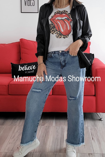 Jeans modelo Wide leg rígido con rotura , bolsillos adelante y atrás