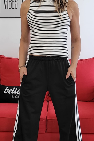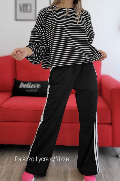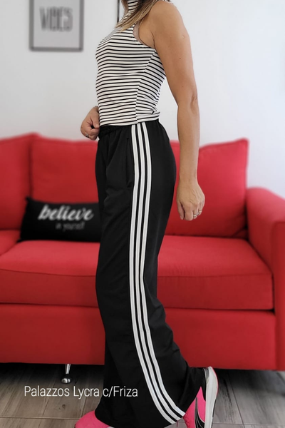 Palazzo de lycra con friza en su interior, 3 rayas a los costados , bolsillos y cintura elastizada , modelo amplio.
