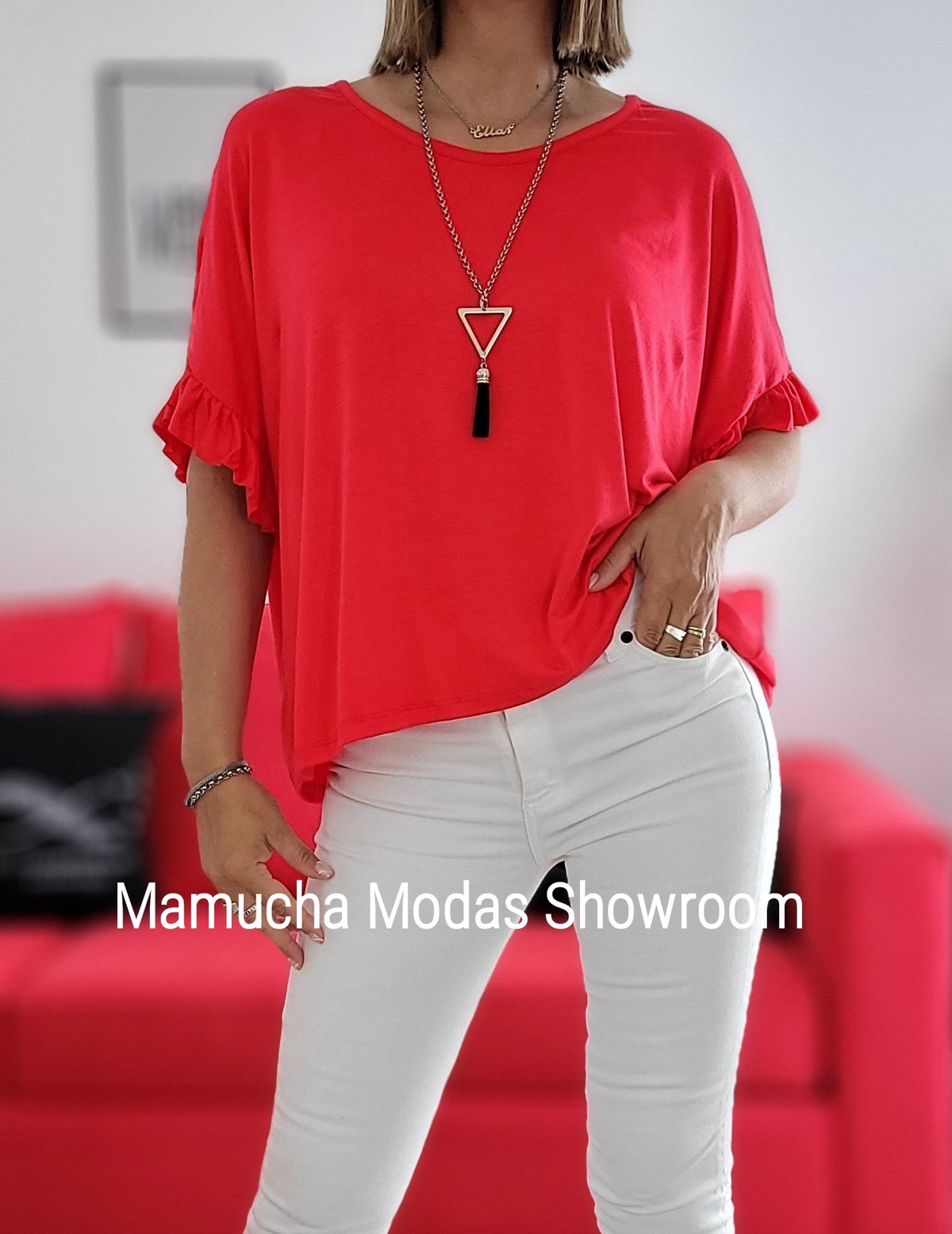Remera oversize de viscosa con volados en las mangas , cuadrada a la cintura, bien amplia