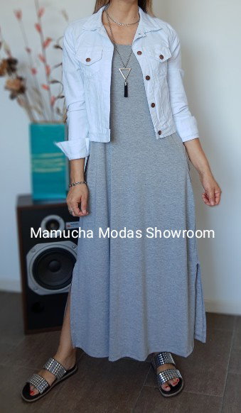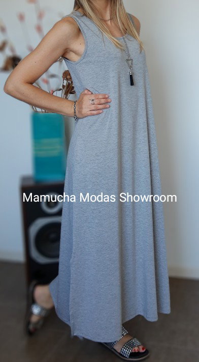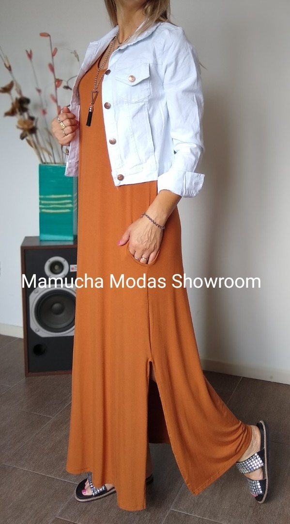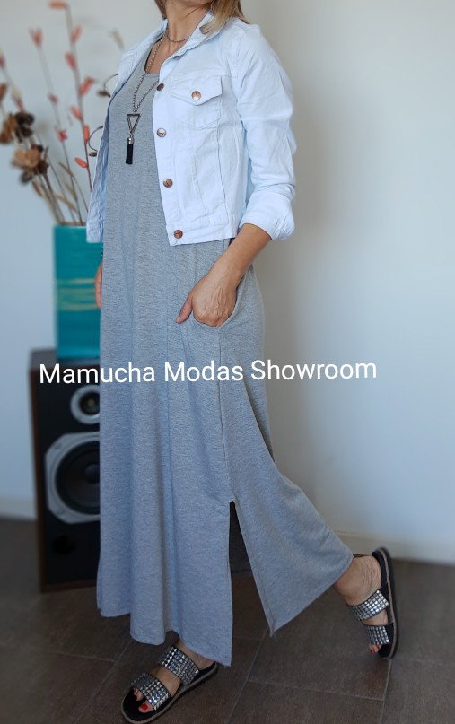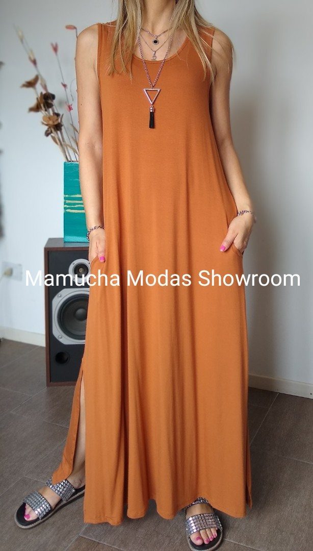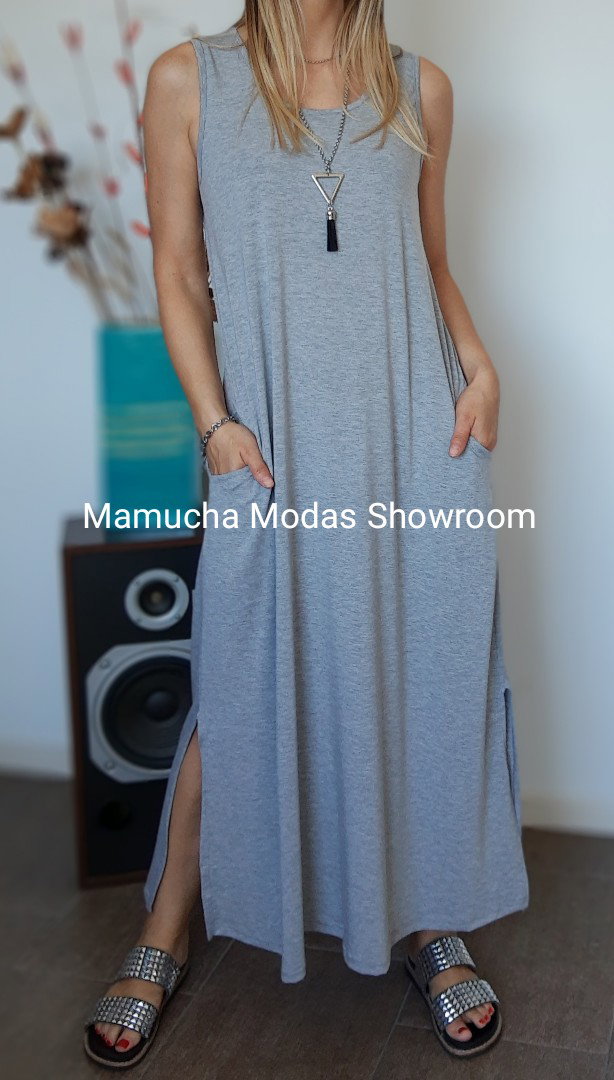 Vestido largo de viscosa con tajos a los costados y bolsillos , muy cómodo y super elastizado.