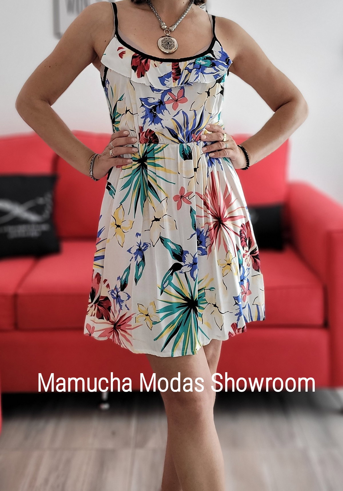 Vestido estampado de fibrana con elástico en cintura y volados en pechera.