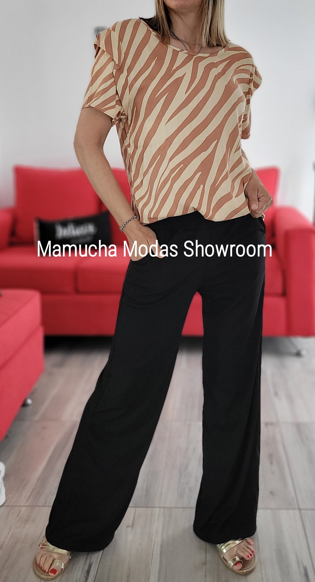 Blusa de lino spandex estampada , con manguitq y detalle en hombro.