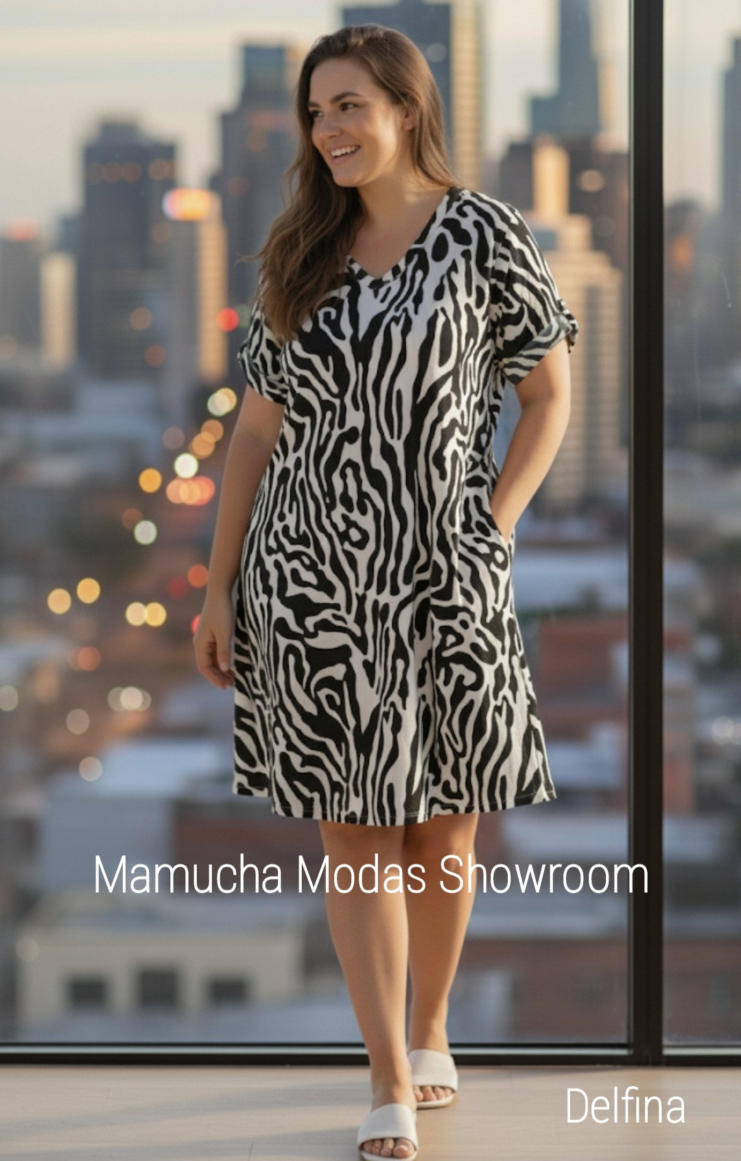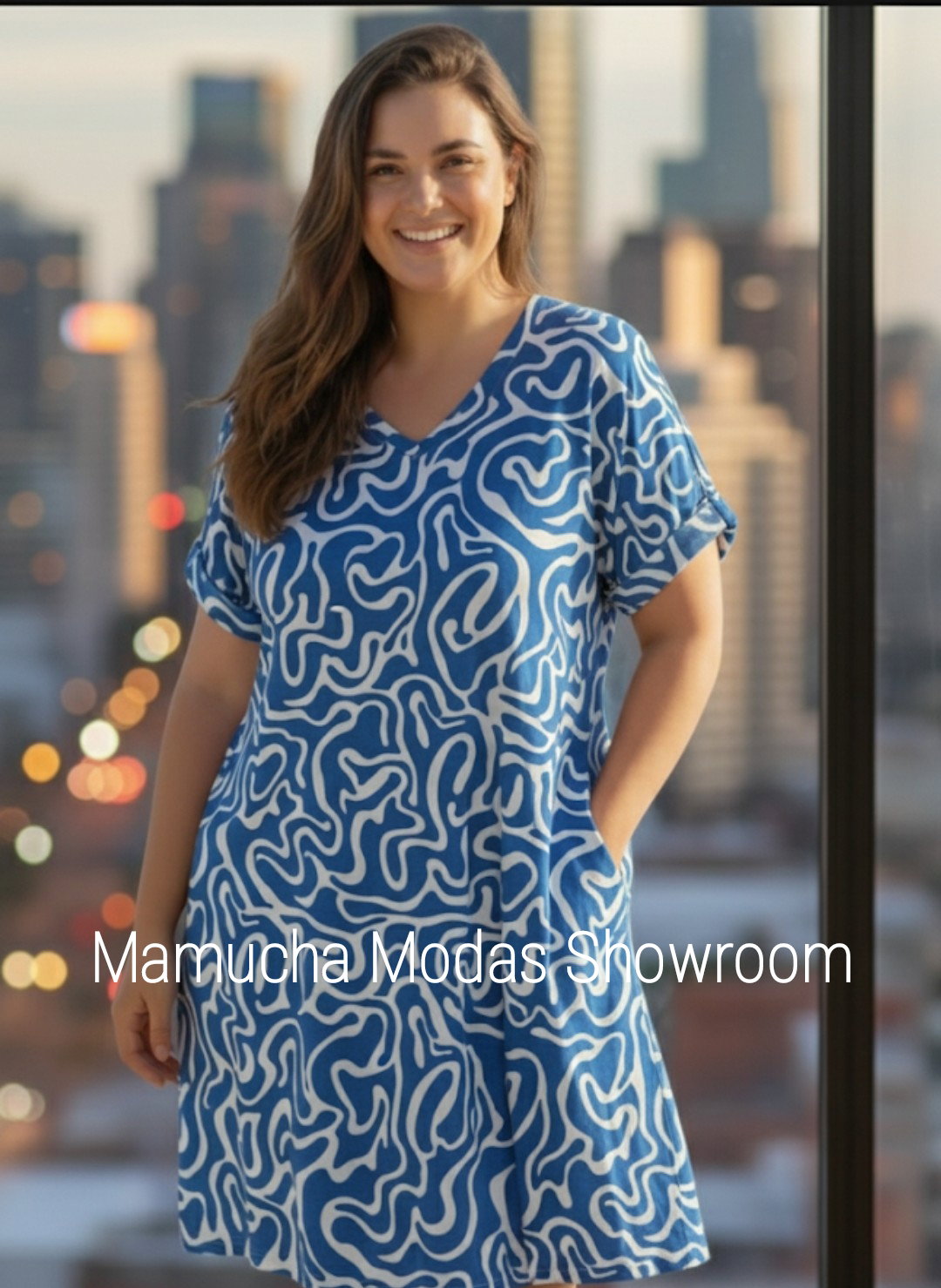 Vestido de lino spandex estampado , con cuello V y bolsillos , manguita con dobles, muy moderno y amplio