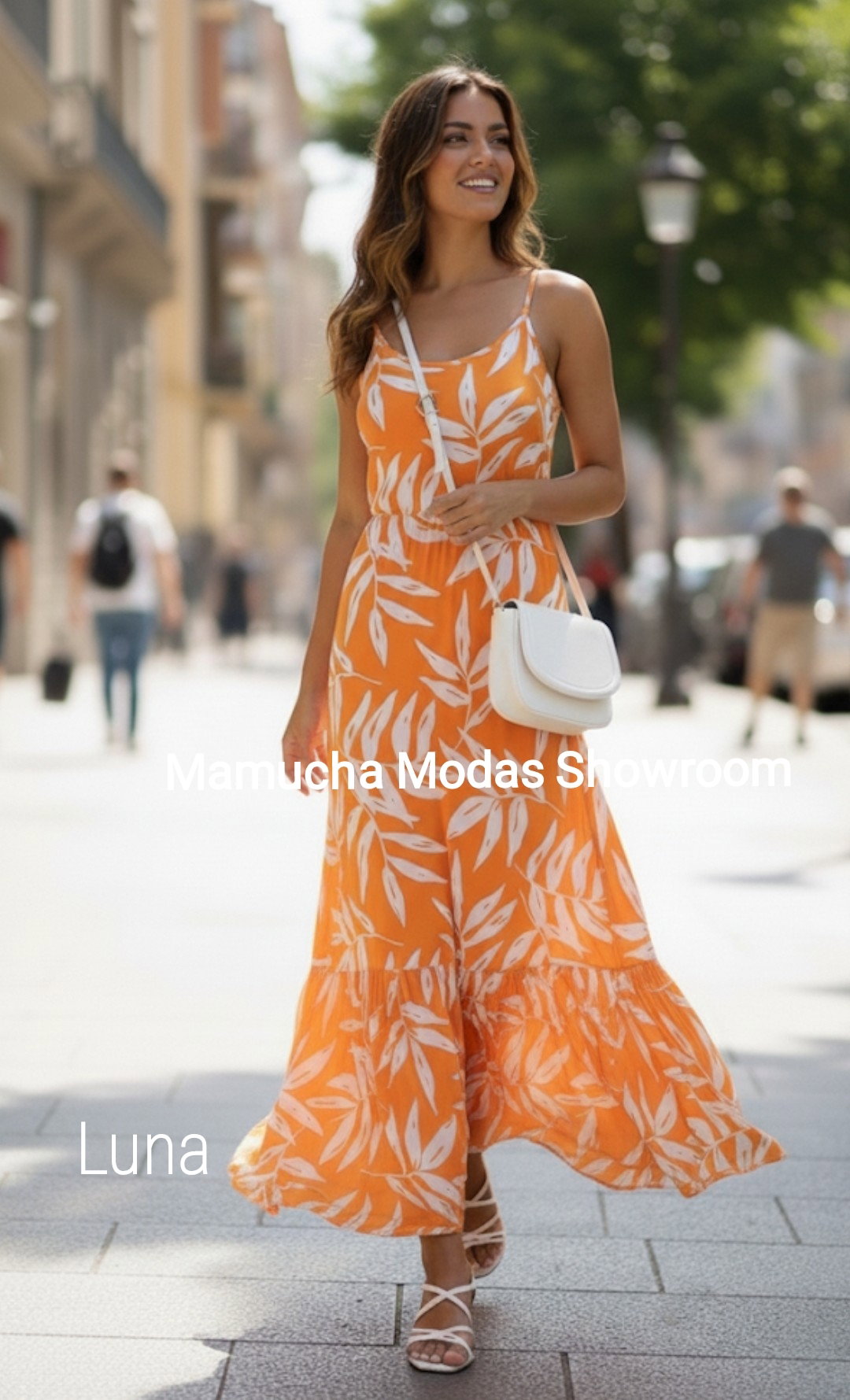 Vestido largo de fibrana estampado con breteles regulables , bien largo
