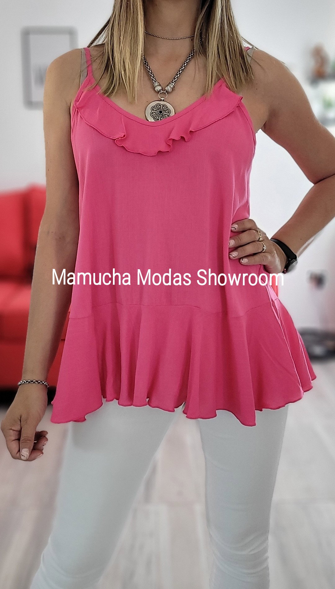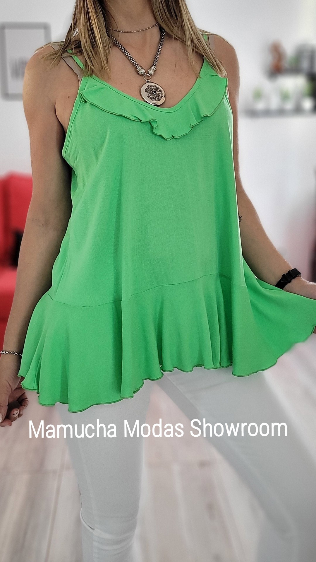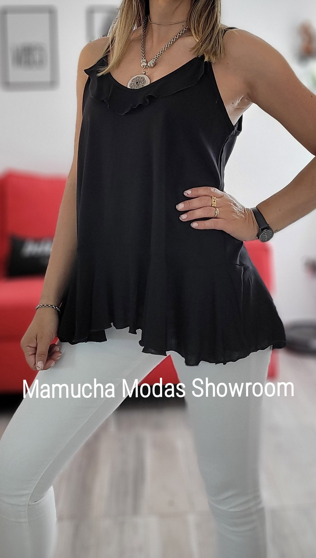 Musculosa de lino spandex con detalle de volado en el pecho y abajo