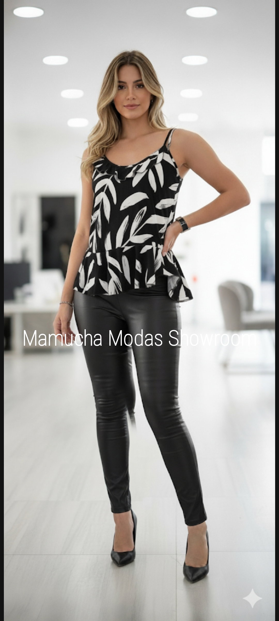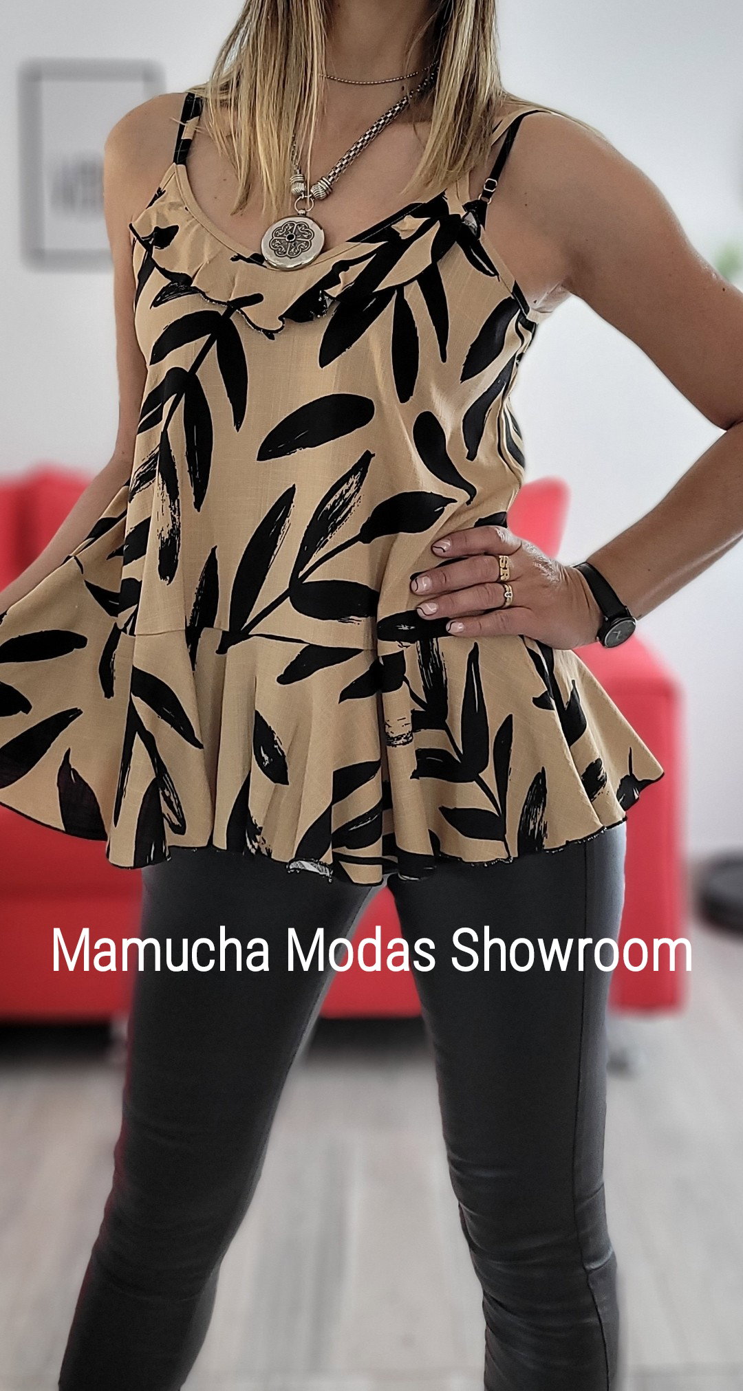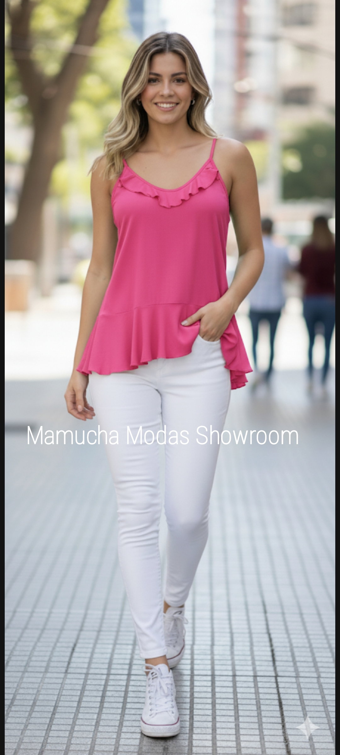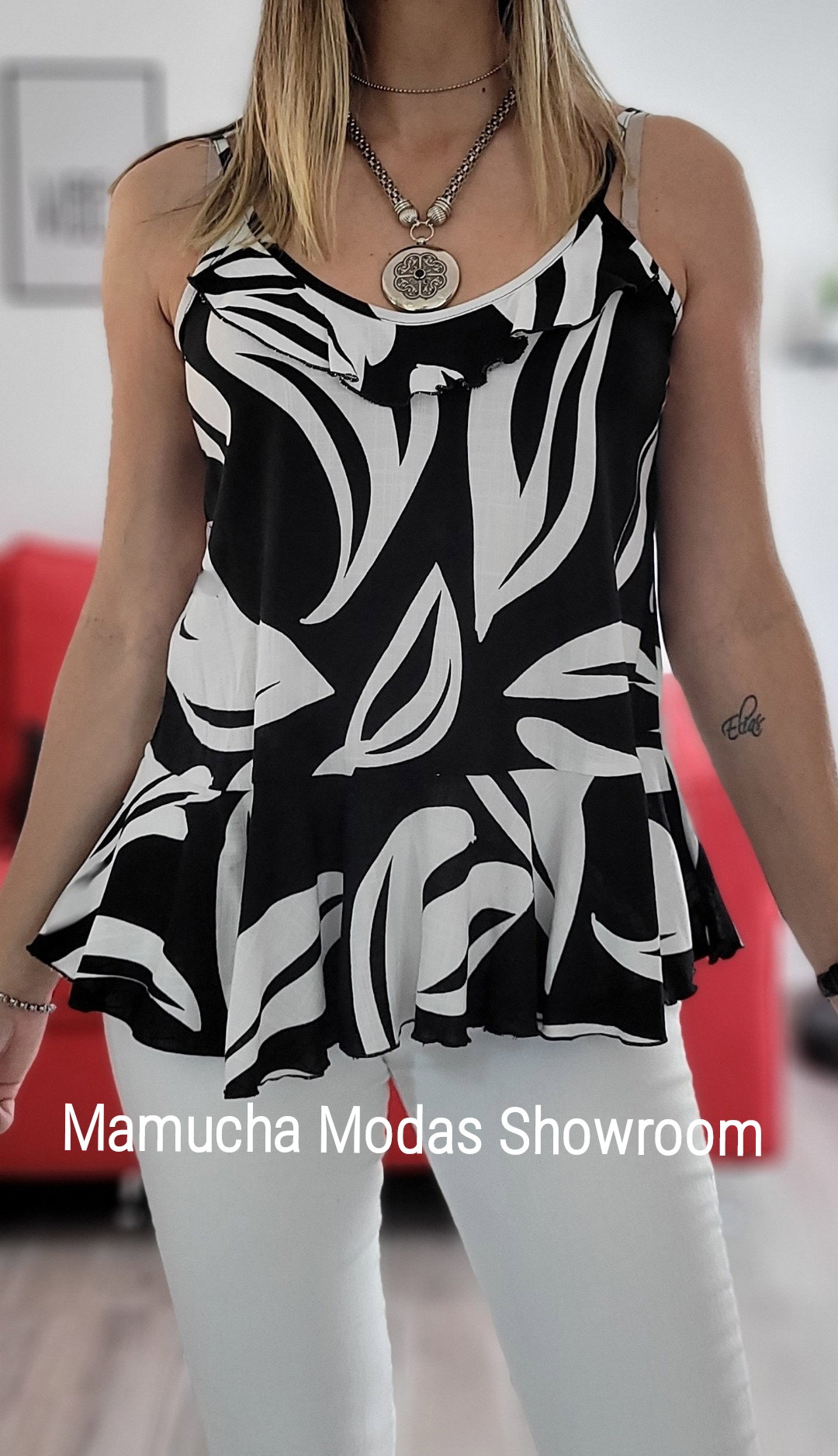 Musculosa de lino spandex con detalle de volado en el pecho y abajo