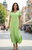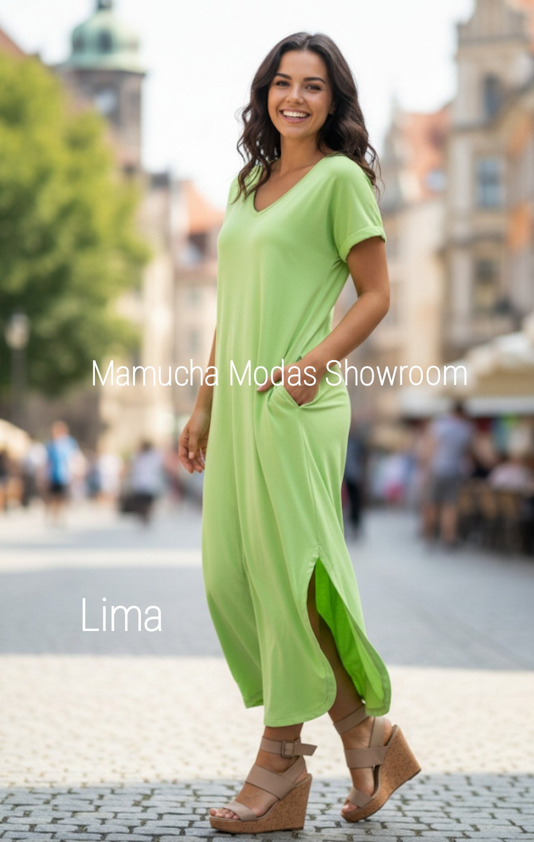 Vestido largo de viscosa con cuello V, bolsillos y tajitos a los costados