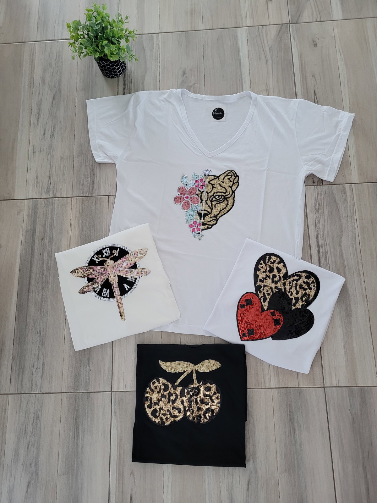 Remera algodón peinado cuello V con apliques , varios modelos