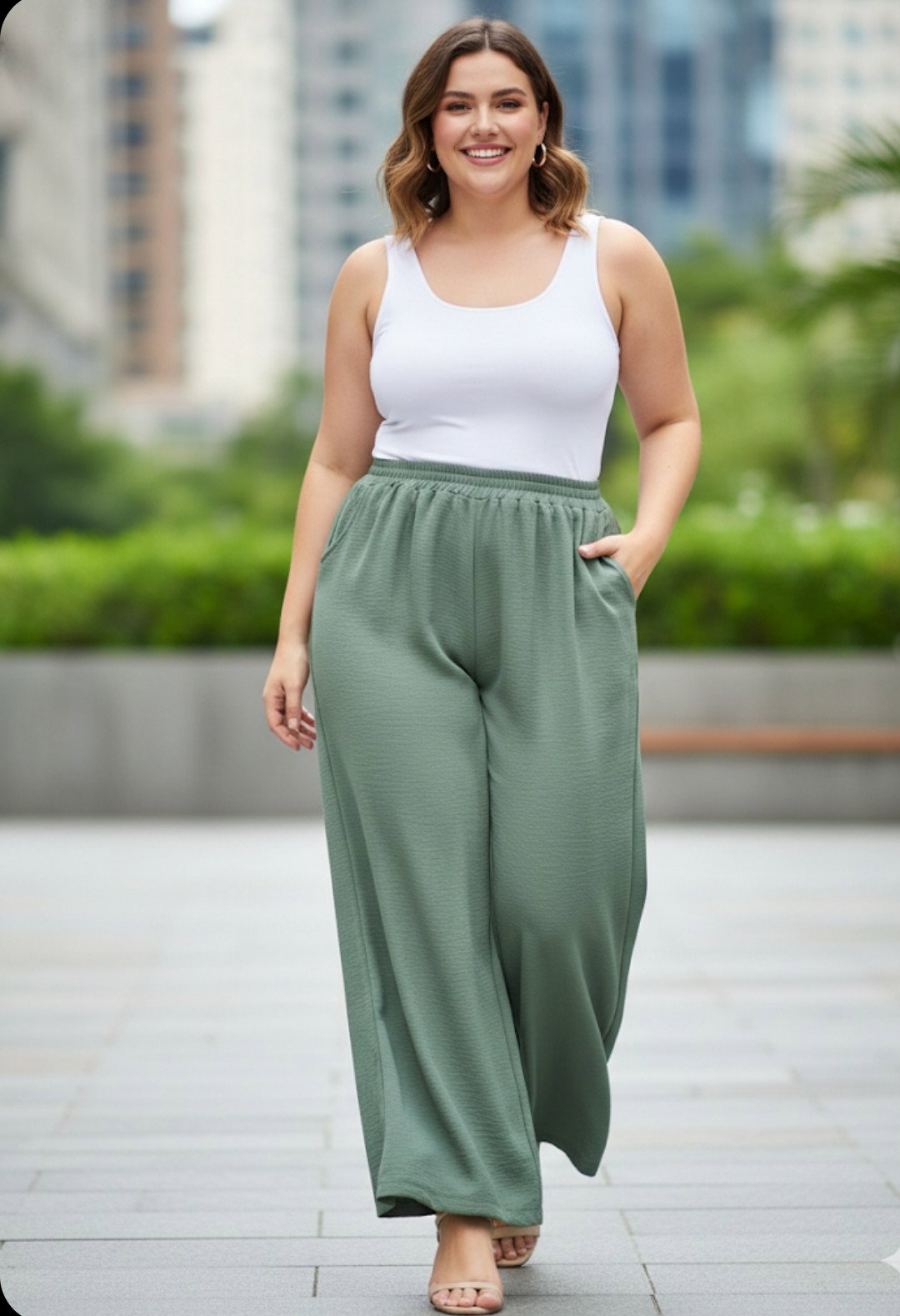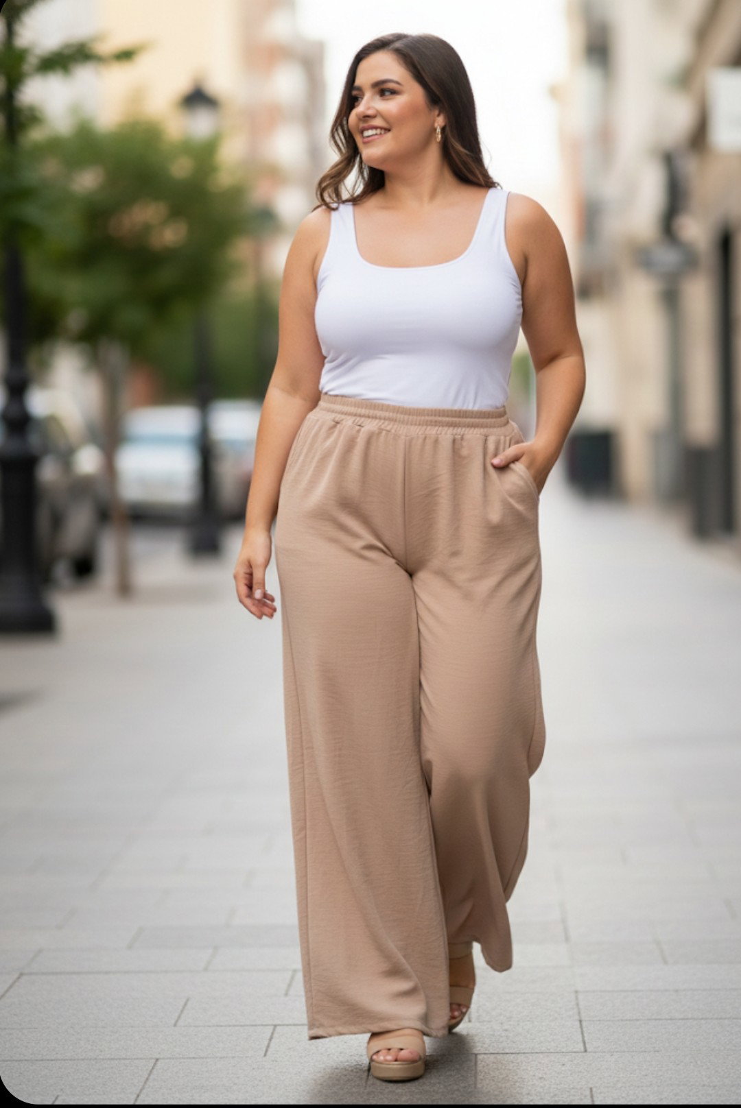 Palazzos de seda cey lisos, cintura elastizada y bolsillos adelante